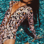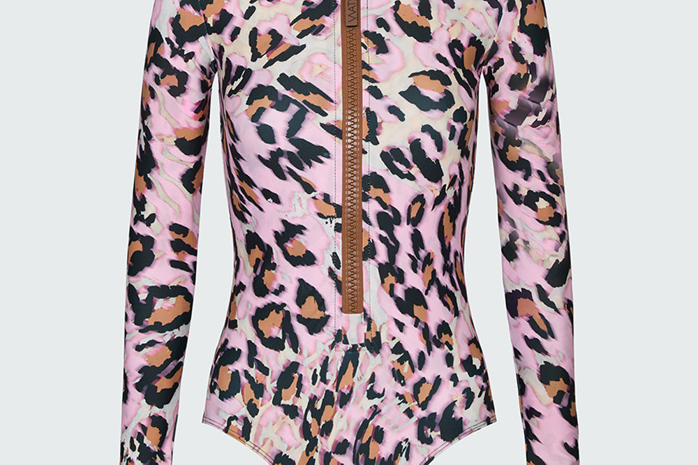 Ryann, our best selling bodysuit, now offered in the trend right Pink Leopard print. This elegant, mock neck bodysuit is crafted from our sun protective UPF 50+ fabric that blocks 98% of the sun’s UV rays. Ryann features our signature Italian zipper, long sleeves, medium back coverage and high cut hips. Our Ryann bodysuit is a swimsuit that can worn as a bodysuit, in and out of the water, allowing you to live your best active life safely, effortlessly and elegantly. You will feel amazing in and out of the water.